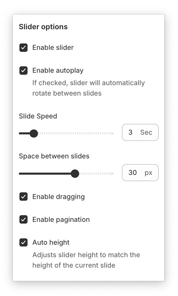 With our slider feature, you have full control over the display of your content. You can enable autoplay to automatically cycle through the slides, add pagination for easy navigation, allow users to drag and swipe through the slides, and adjust the slide speed to suit your preferences.