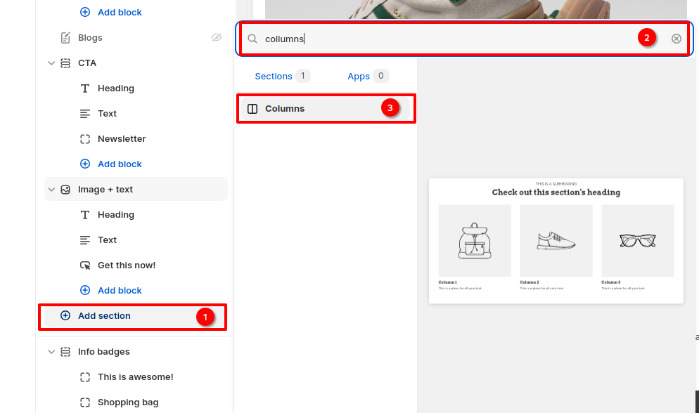 In order to add columns section, go to "Sections" tab in the Theme Editor. Click on Add Section > Columns