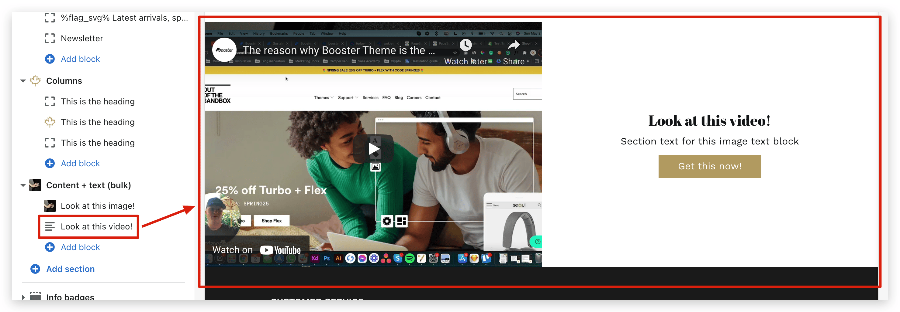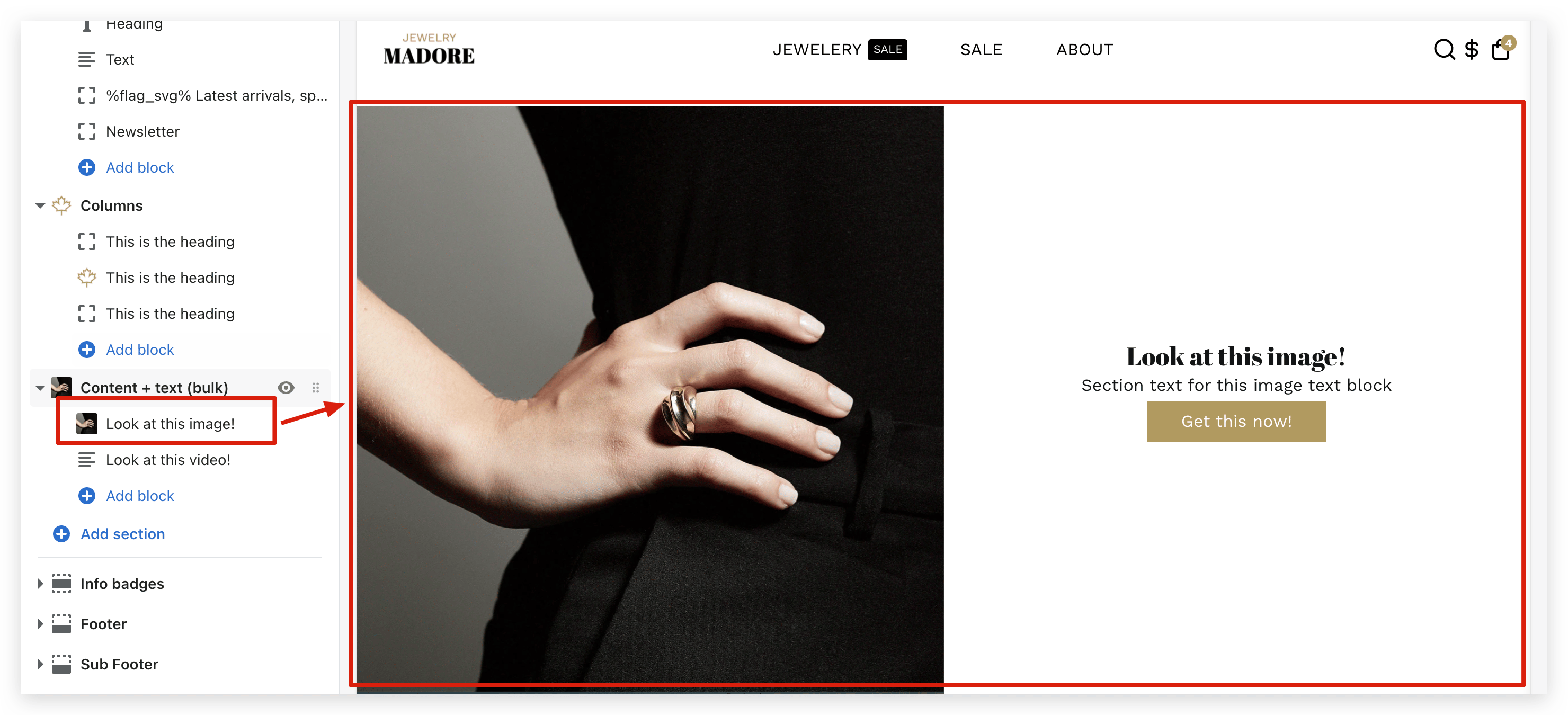 The content + text section allows you to display an image or a video on one side of the section and a text on the other side.