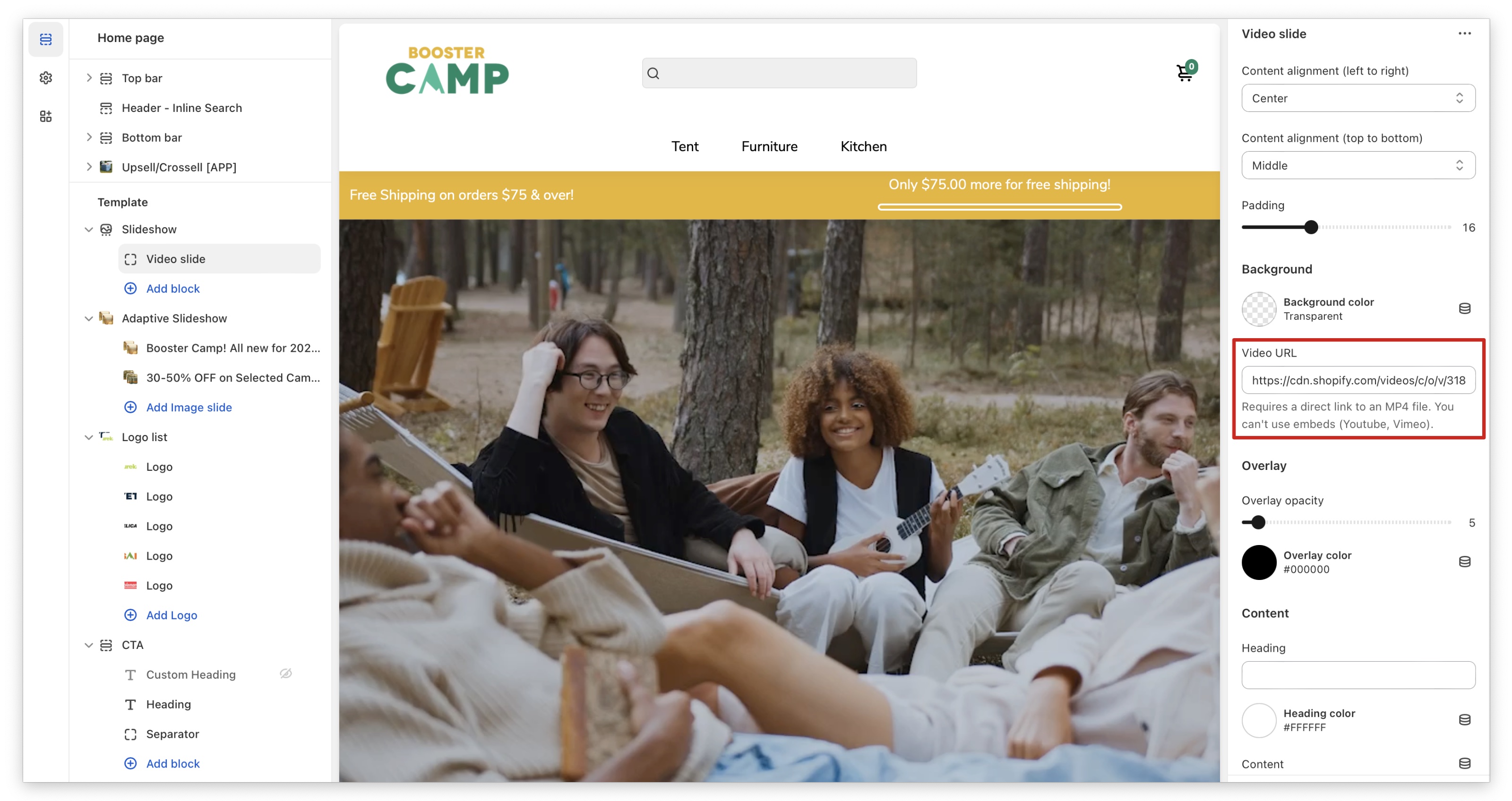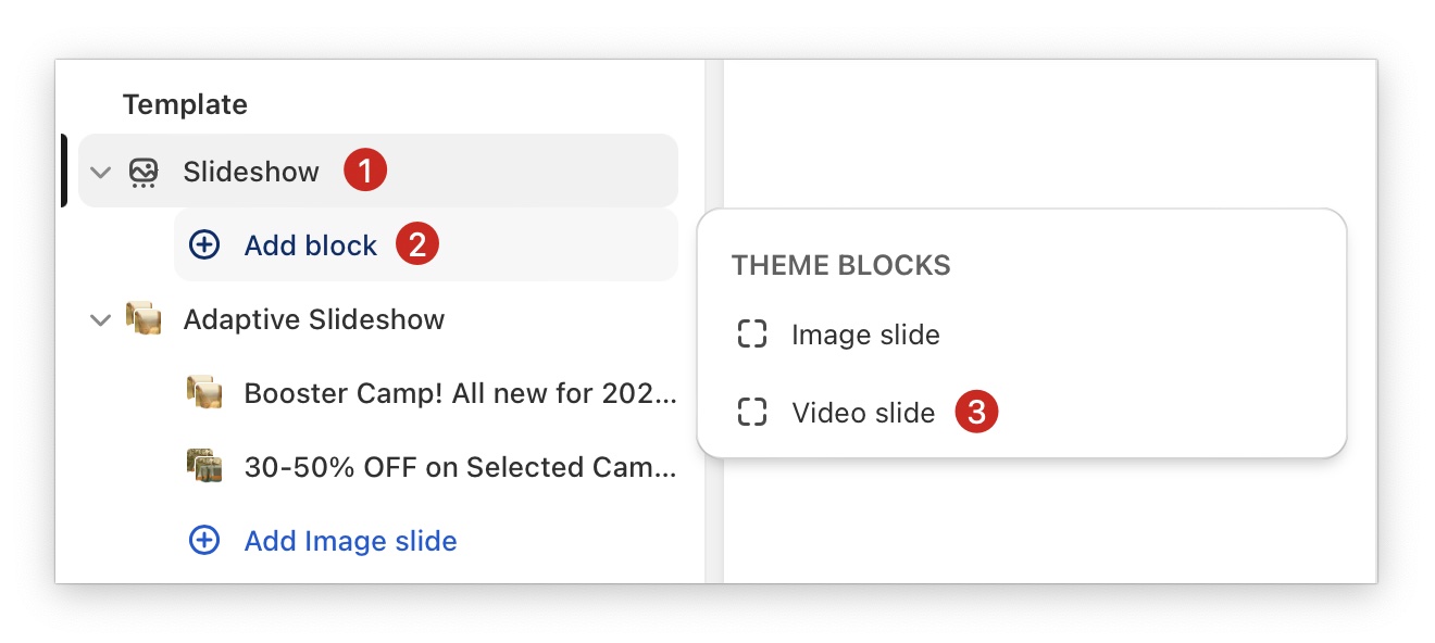 You can't add a YouTube or Vimeo video to the slideshow section directly. To use a video in the slideshow, you need to upload it to your Shopify files first.