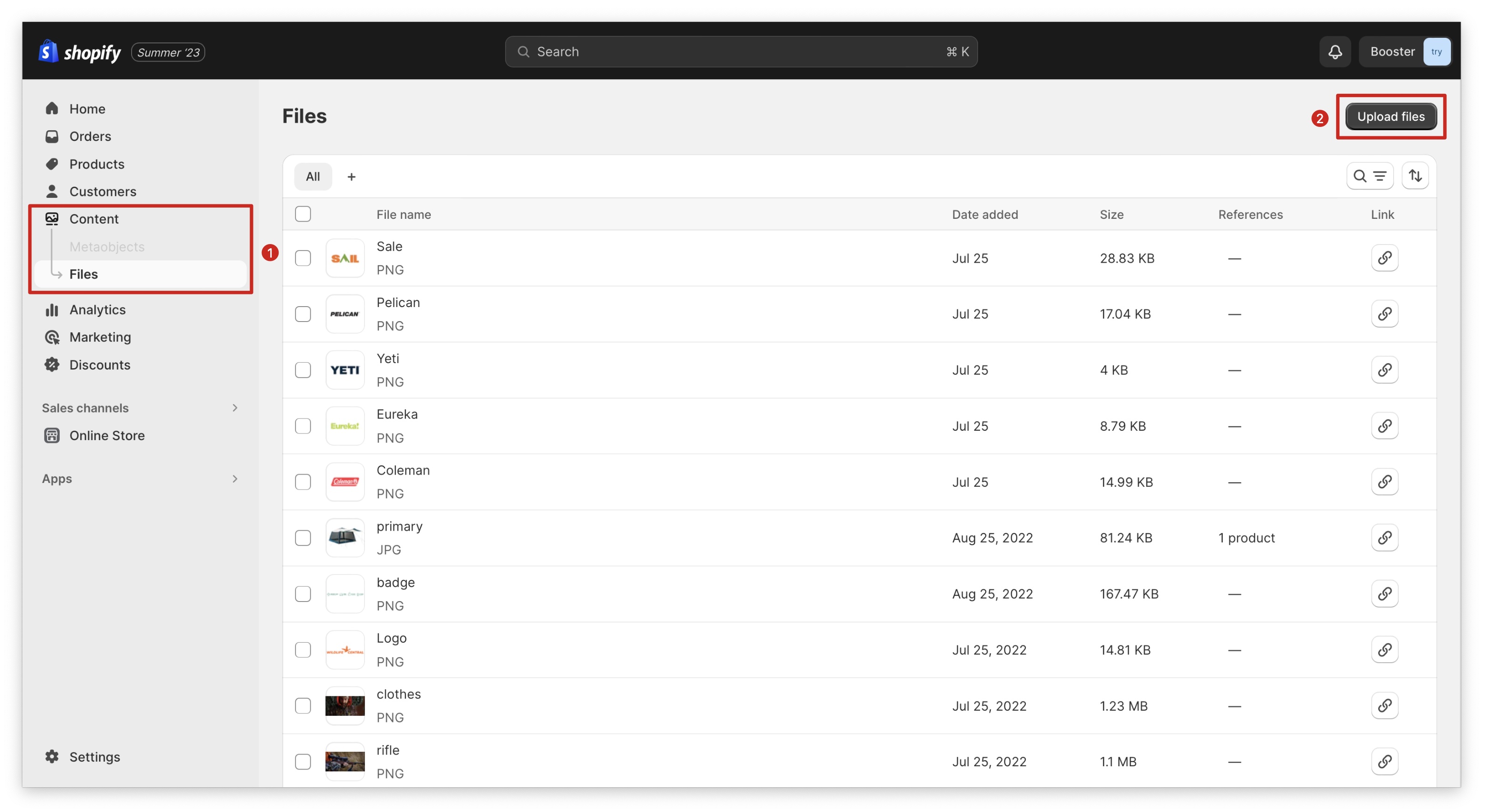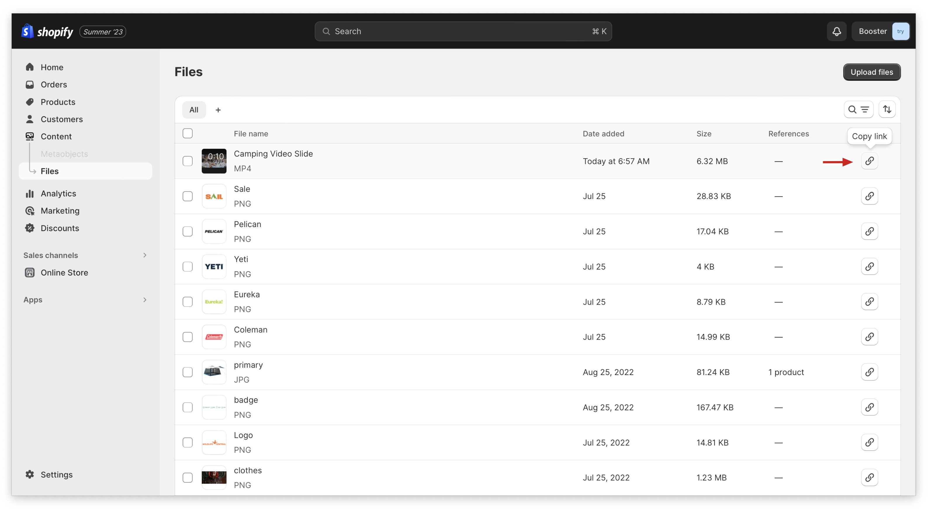 Go to Content > Files. Click Upload files and choose the video you want to upload.
