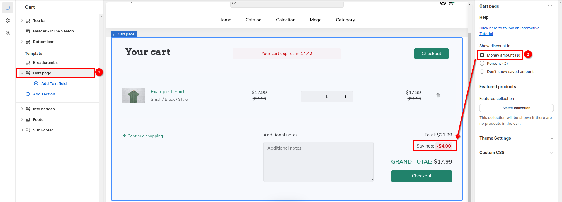 The cart page offers several customization options, including the ability to display discounts and featured products. There are three options to choose from for discount: Money amount, Percentage, and Don't show saved amount. Here's a detailed description of each option: