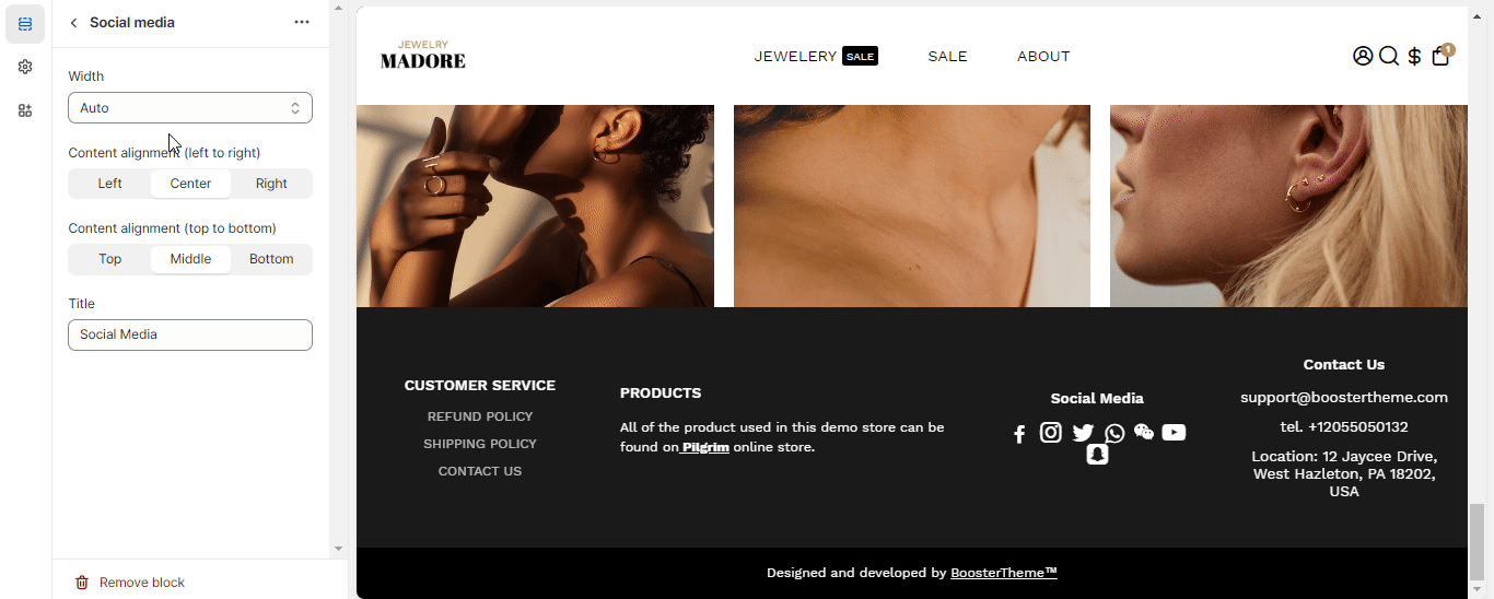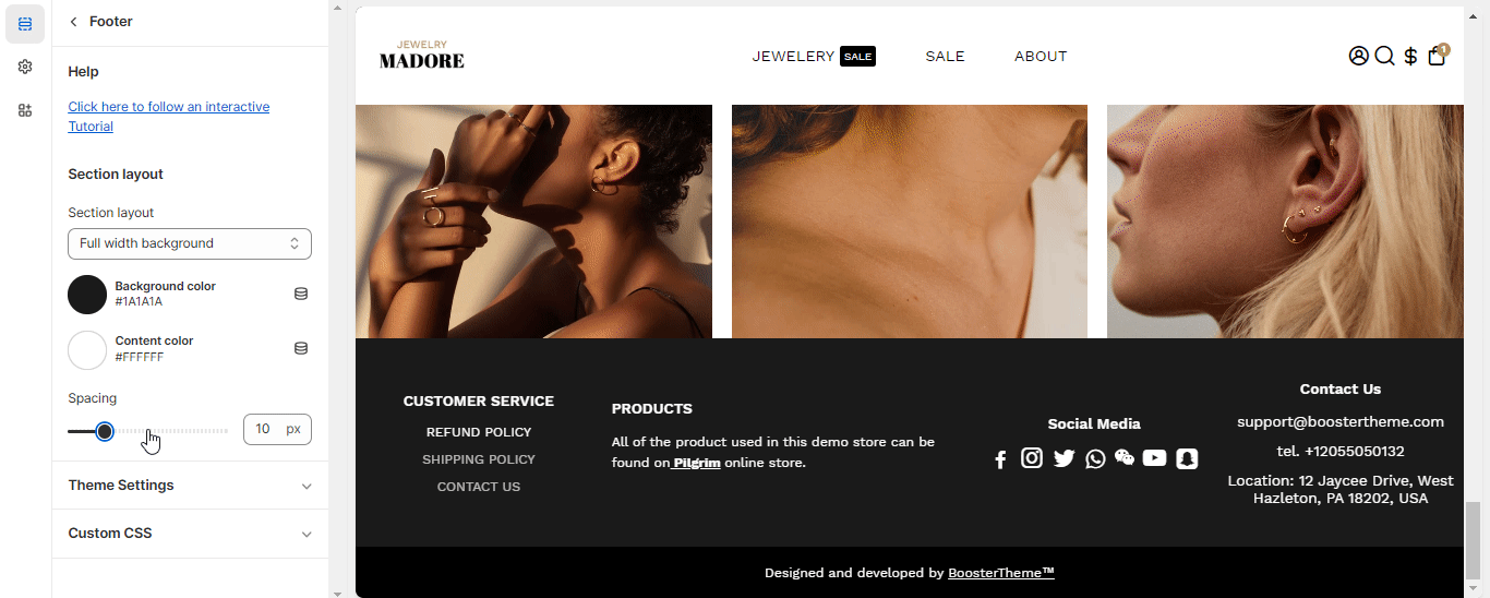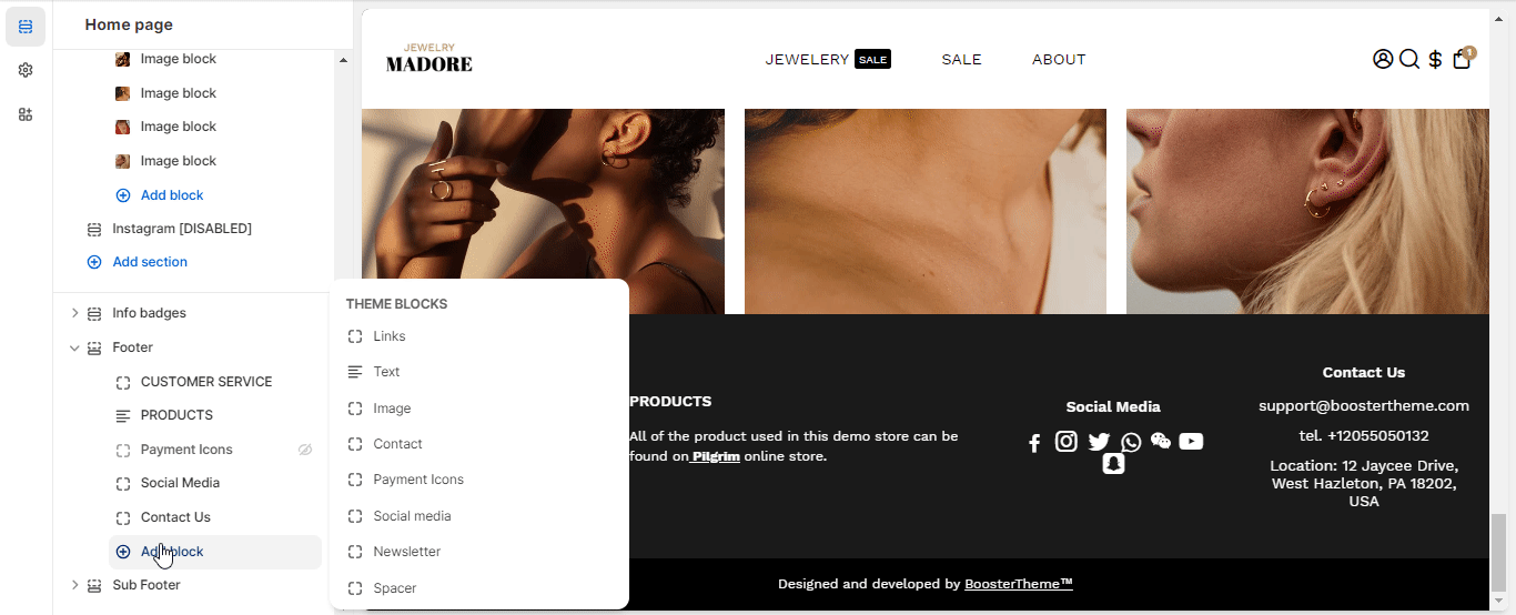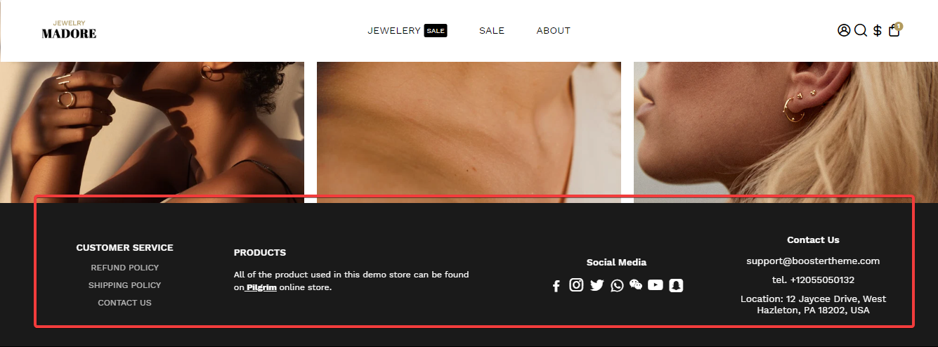 The Footer Feature allows you to display content like a spacer, image, text, scrolling messages, social media icons, and contact information at the bottom of all the pages of the online shopping website. Now, let's find out how to set up Footer in the Booster Theme.