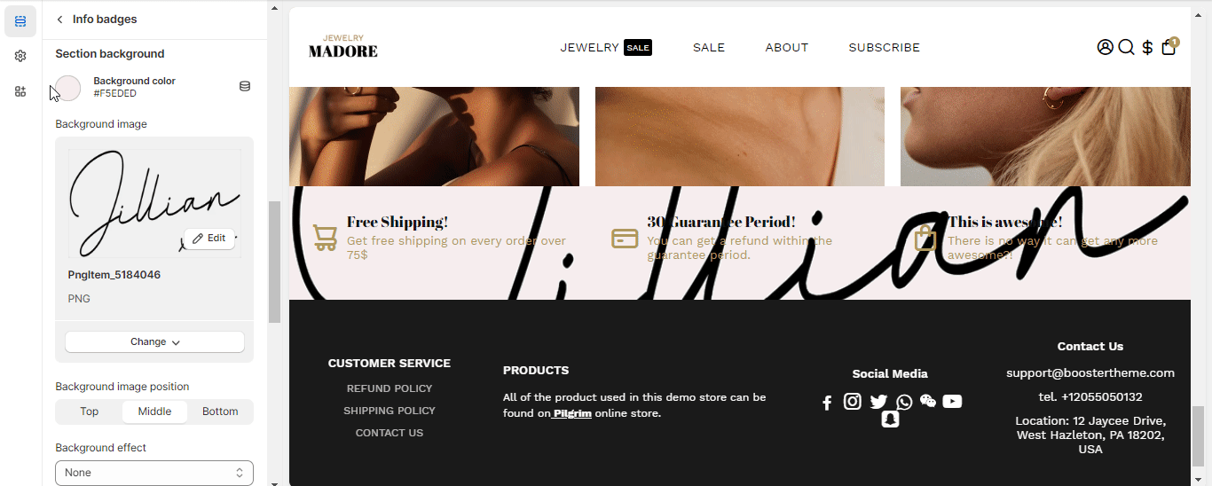This option allows you to add a background color or image and place the position of your Info badge. You can also add a background effect, and enable the Parallax feature.