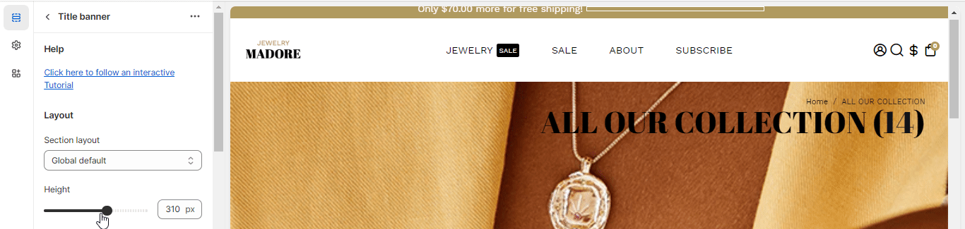 Alter the height of your title banner with this setting provided. Our Booster Theme ensures that you get full flexibility in customizing your storefront. Pick a choice from the range anywhere between 0 px to 500 px.