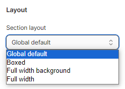 With this option, we allow altering the layout of a particular section. There are four different selections in the dropdown list for you to choose from. Pick an option of your choice from Global Default (1), Boxed (2), Full-Width Background (3), or Full-Width (4).