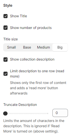 You can change the style of the title added to your banner. We provide this option for our users to alter the look and feel of the title of their webpage. In this setting, you can also decide if you display the title banner or not. You can also limit the description length if you enable the collection description.