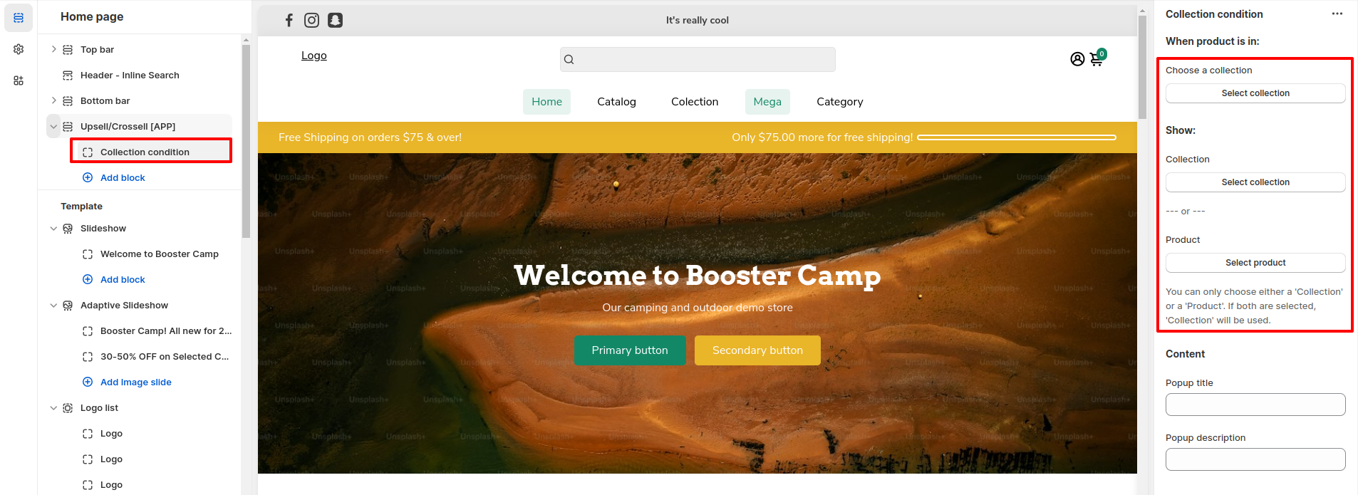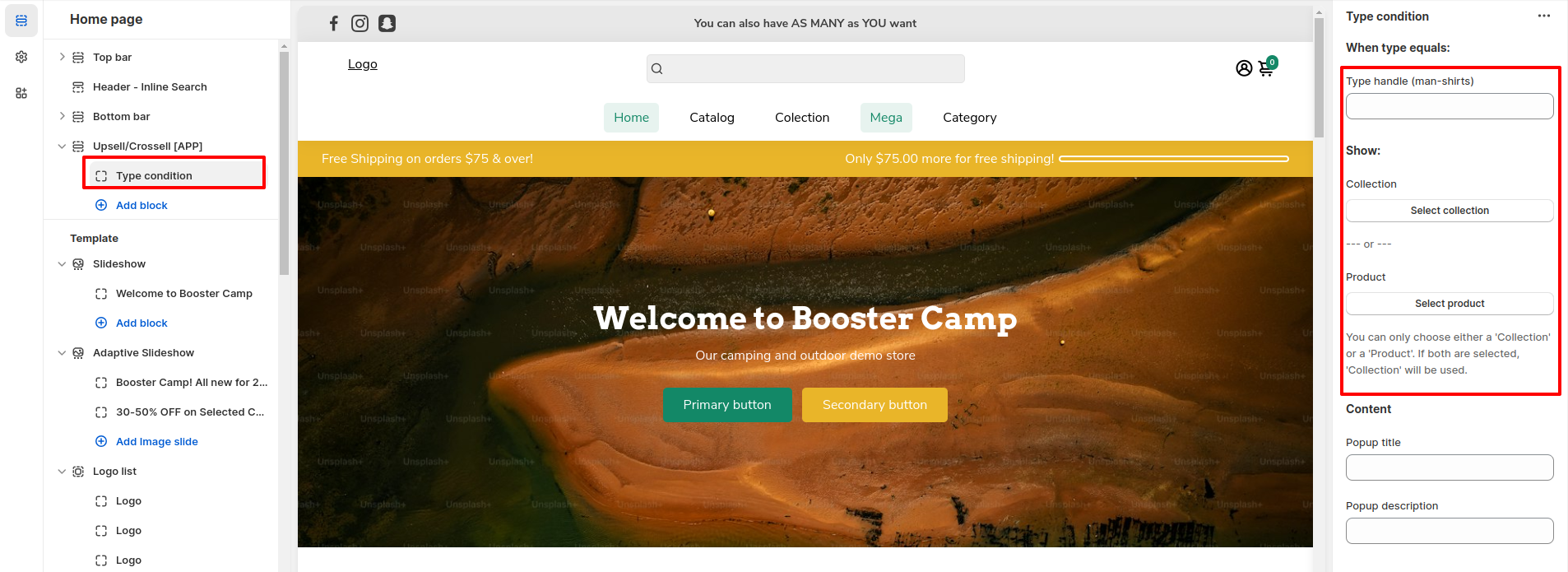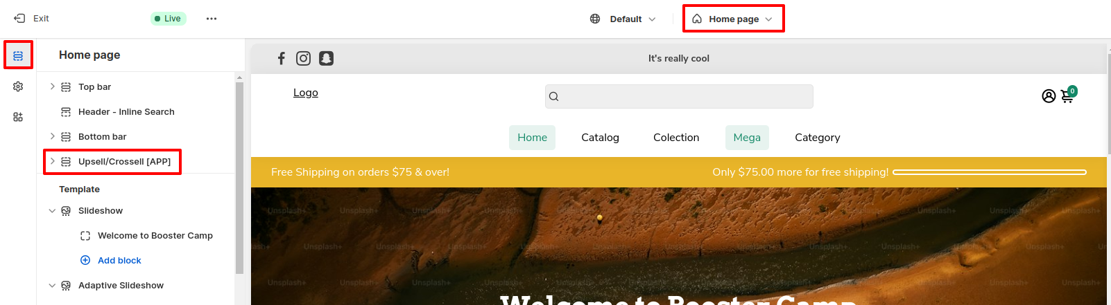 To access the Upsell/Crossell settings, click Customize (Themes section on Shopify) > Home page > Section > scroll down to Upsell/Crossell.