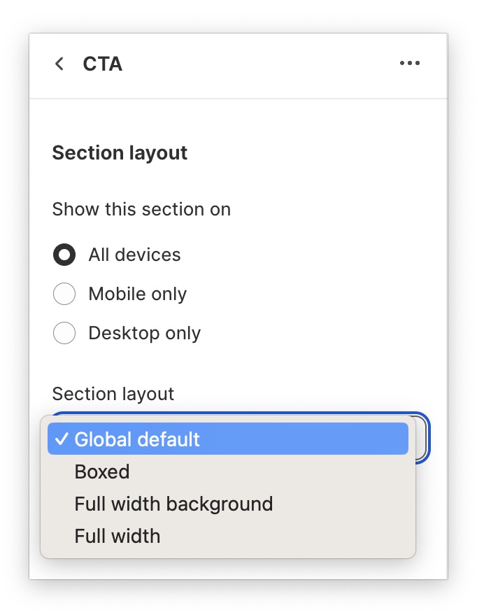 Therefore to change it from the global default, go in the section settings to « section layout » and choose another layout.