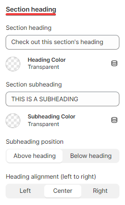 This helps you to provide a clear and concise preview of the section. The setting includes the option to add a Heading and subheading, and change their alignment and text color.