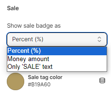 In this setting, you can enable or disable the Sale Tags and change their color. You can choose between Percentage (%), Money amount, and Only "Sale" text.