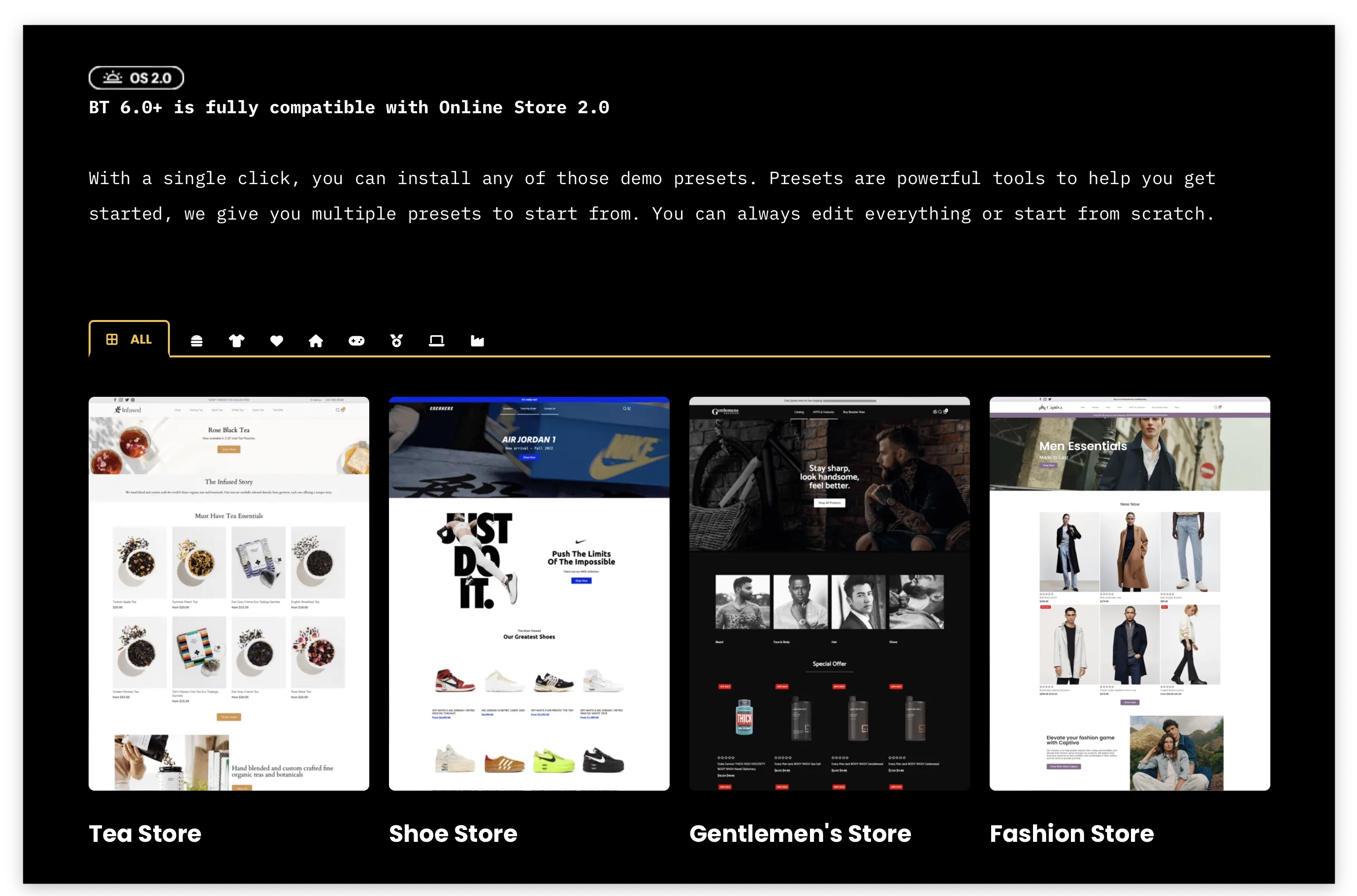 We've created conversion-optimized demo stores that you can install directly on your Shopify store. These demos are a great way to get started with your online store design, even if you don't have any prior experience.