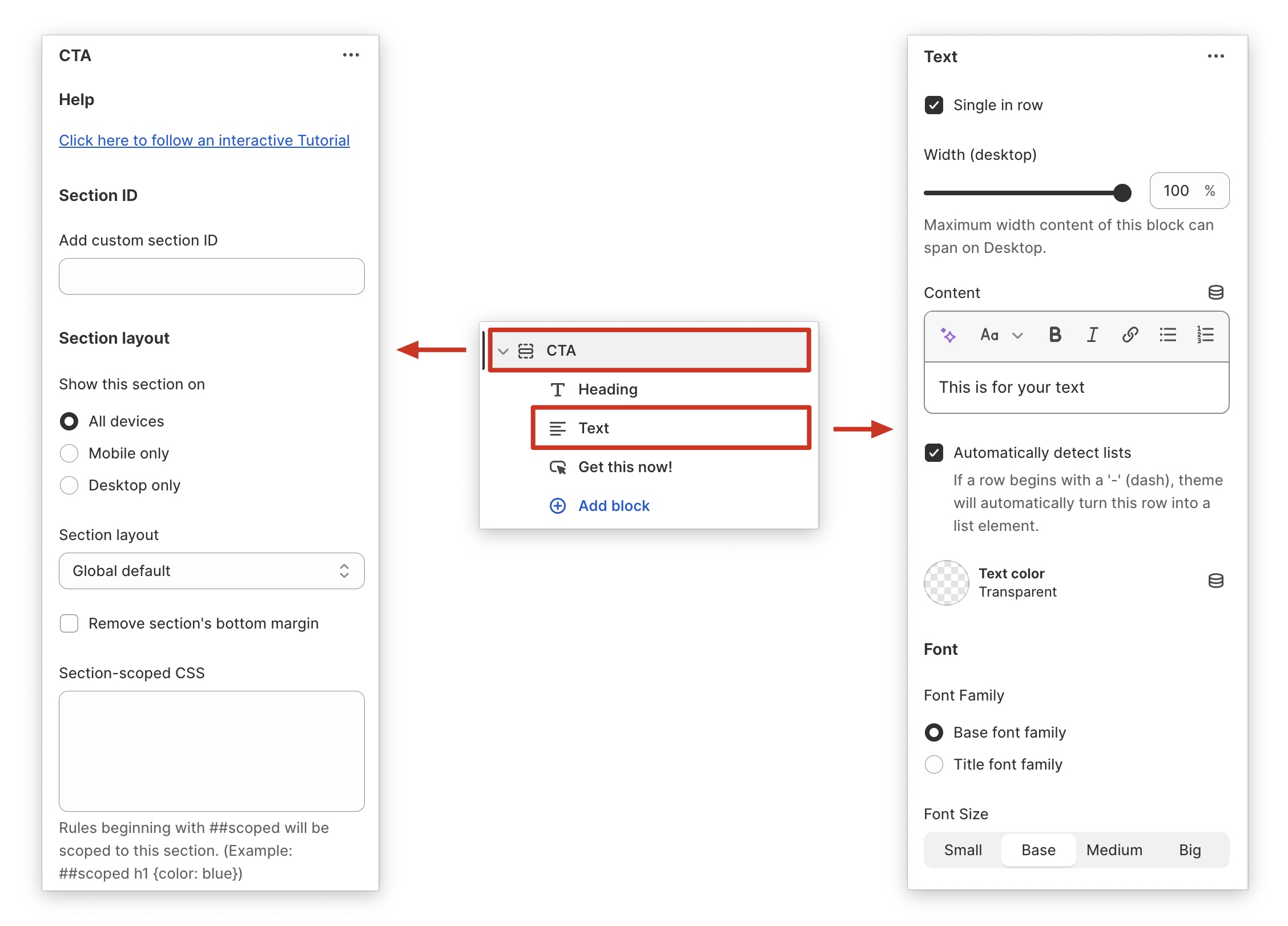 Use section and block settings to customize your content. Add your content in the settings and customize it as needed. To access the settings, simply click the item.