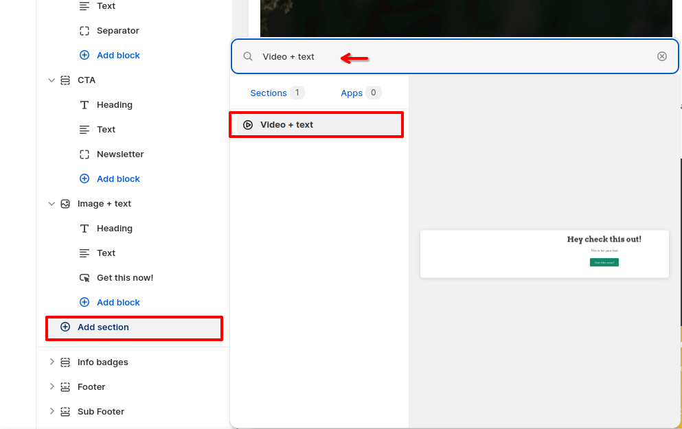 To add a Video + text section, go to the "Sections" tab in the Theme Editor. Click on Add Section > Video + text.